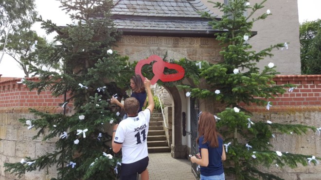 Diese werden dann aufgeladen und an den wichtigen Stationen der Verlobten aufgestellt und liebevoll geschmückt. An den Elternhäusern, dem Ort der Trauung, der Feierstätte und dem Heim des Brautpaares entstehen so jeweils kleine Spaliere an den Eingängen, durch die das Paar schreiten kann. Dieser Brauch soll Glück bringen und ist ein Zeichen von Verbundenheit und Freundschaft. Oft nehmen sich die Freunde/Verwandten dafür sogar extra Urlaub.